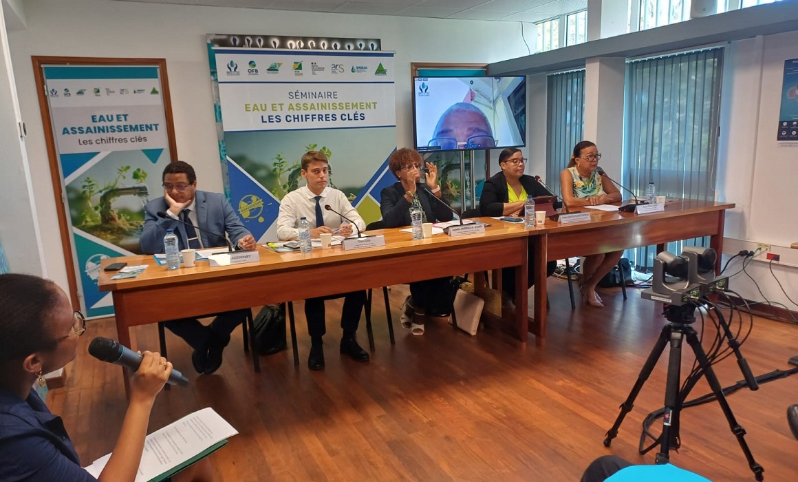 L’Office de l’eau de la Guadeloupe a dévoilé mercredi 11 décembre, les chiffres de l’eau lors d’une conférence de presse organisée à son siège, situé au Jardin Botanique de Basse-Terre. Plusieurs acteurs étaient présents : Isabelle Amireille, présidente déléguée de l’Office de l’eau, Nicole Sinivassin, vice-présidente de la Communauté d’agglomération Riviera du levant (Carl) et déléguée syndicale du Syndicat mixte de gestion de l’eau et de l’assainissement de Guadeloupe (SMGEAG), Marcus Ag-Bekodo, directeur général du SMGEAG, Sylvie Gustave dit Duflo, présidente de l’Office français de la biodiversité, Théo Gal, sous-préfet chargé de l’eau en Guadeloupe, et Laurent Legendart, directeur de l’Agence régionale de santé (ARS).
