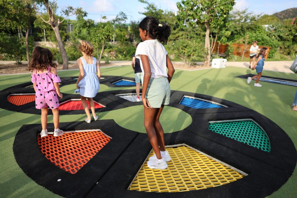 Placés au niveau du sol, ils améliorent la sécurité en réduisant considérablement le risque de chute de hauteur, et sont d’accès plus aisé pour les enfants de tous âges et toutes capacités, rendant le jeu plus inclusif. Leur forme serpentine et leur éclat de couleurs, ajoutent de la gaieté à l’espace. Les enfants s’y dépensent beaucoup (le trampoline a été reconnu par le Comité international olympique comme une discipline à part entière et défendu pour la 1ère fois aux Jeux olympiques de Sydney en 2000). Encastrés, ils sont moins soumis aux aléas climatiques cycloniques.