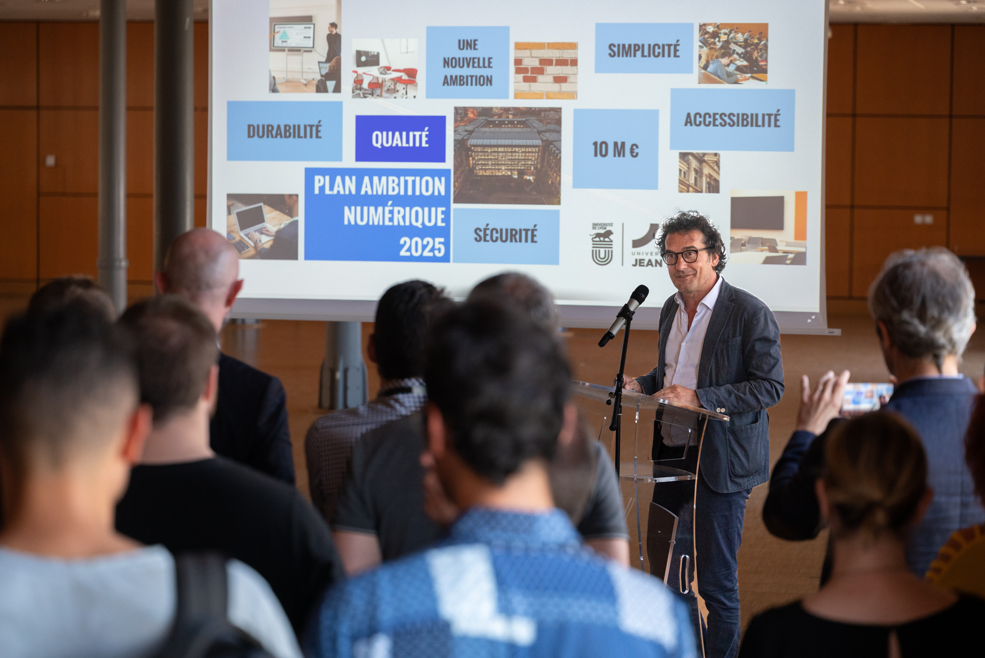 Au micro sur la photo en tête de page (crédit : X UEJM3), Eric Carpano présentait le 8 juin 2023 le Plan ambition numérique 2025 de l’université Jean Moulin Lyon 3 d’un montant de 10 millions sur 3 ans pour « investir pour préparer l’avenir et relever les défis de la transformation digitale et écologique ». On comprend que l’annonce des coupes budgétaires passe mal.