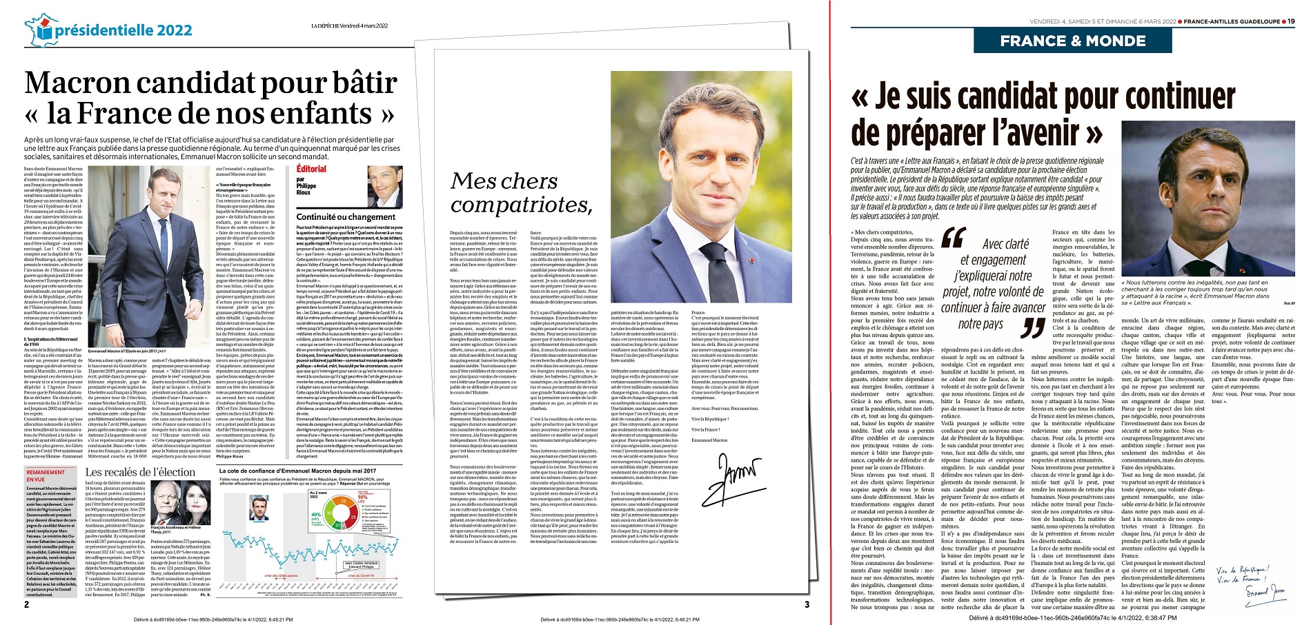 Emmanuel Macron a vu sa lettre de déclaration de candidature adressée à la presse le 3 mars publiée dans les titres de la presse quotidienne le 4 mars. Ici l'exemple du quotidien La dépêche du midi qui présente à ses 2,441 millions de lecteurs le 4 mars en vis-à-vis des articles journalistiques en page 2, une pleine mise en page publicitaire en page 3. Le quotidien France-Antilles Guadeloupe a procédé à une mise en page dans ses pages France de l'édition du 4 mars.